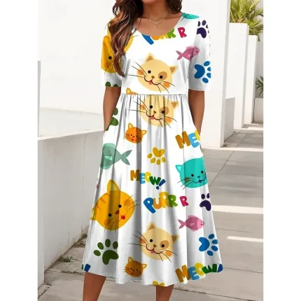 Women’s Midi Dress Summer Dress Pleated Dress Vacation Casual Holiday Regular Fit Graphic Animal Cat Half Sleeve Crew Neck Black White Brown Summer Spring